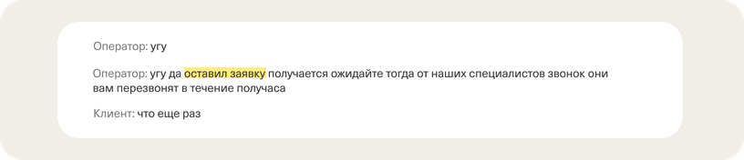 Например, следующий шаг после оформления заявки — звонок клиенту из другой команды. Проверить, что оператор это упомянул, можно с помощью словаря