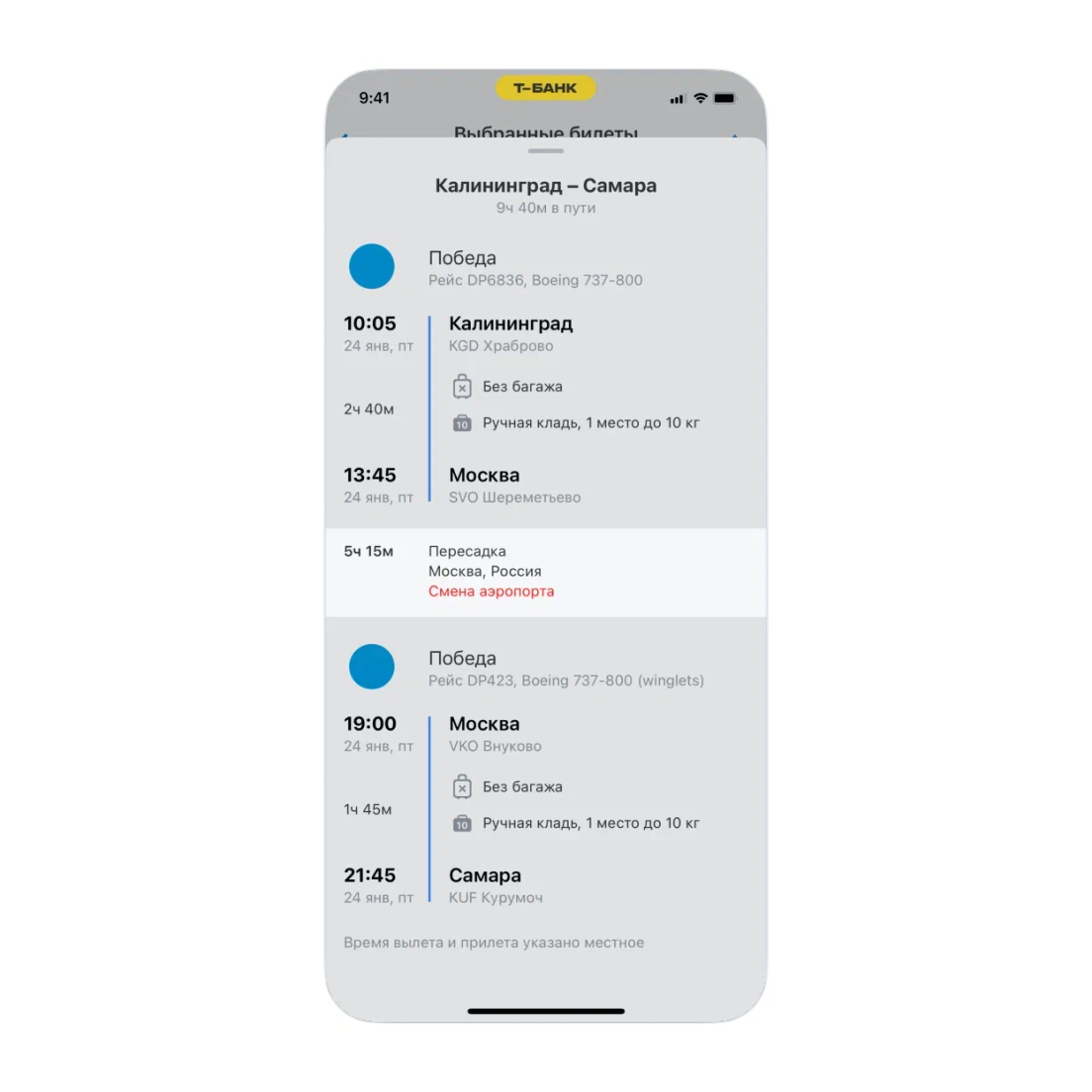 Например, вы живете в Самаре и планируете поездку в Калининград. Сначала вы оплатили билет из Самары в Санкт-Петербург, а из Санкт-Петербурга в Калининград — только на следующий день. В итоге перед поездкой у вас есть две маршрутные квитанции. Их не получится объединить, даже если рейсы выполняет одна авиакомпания.