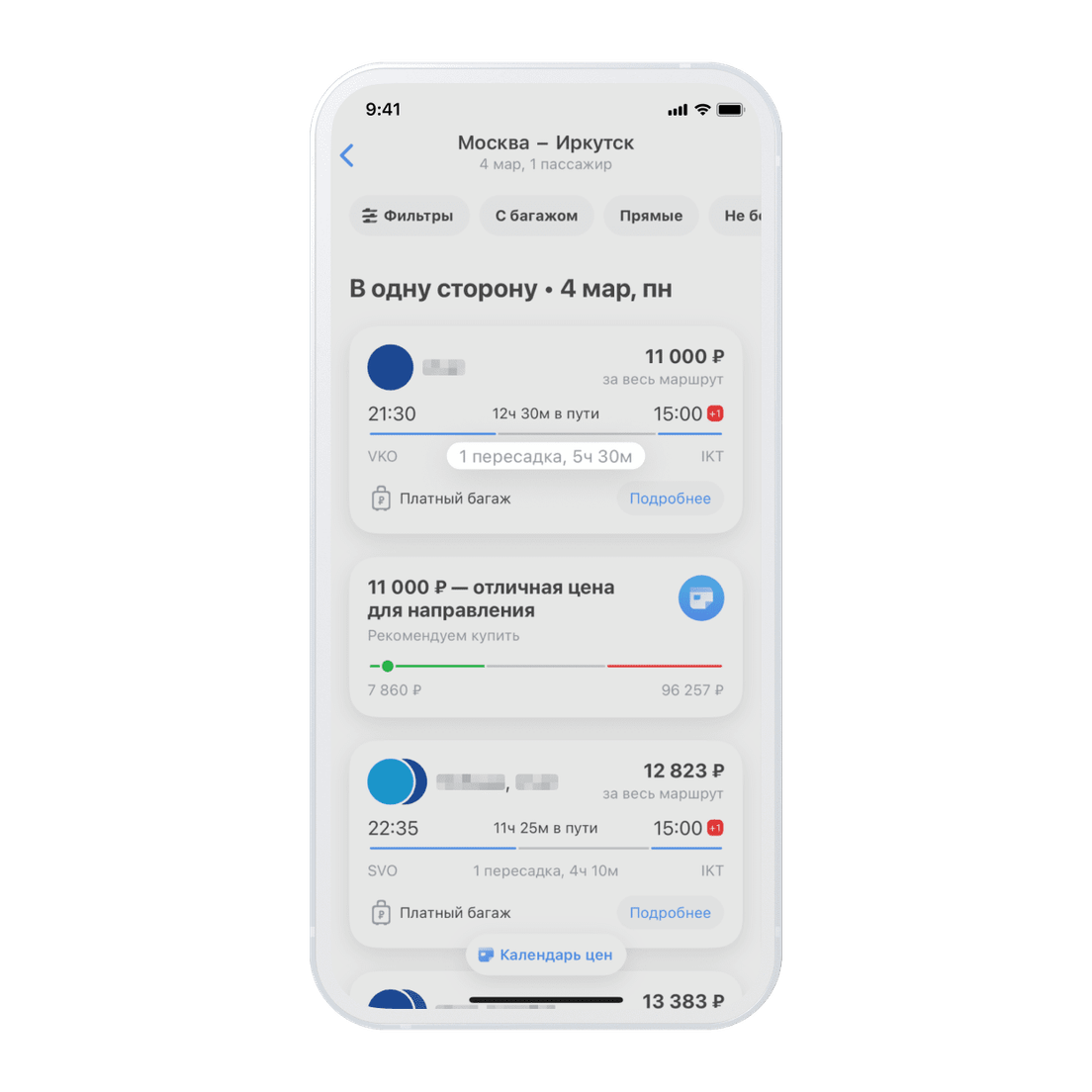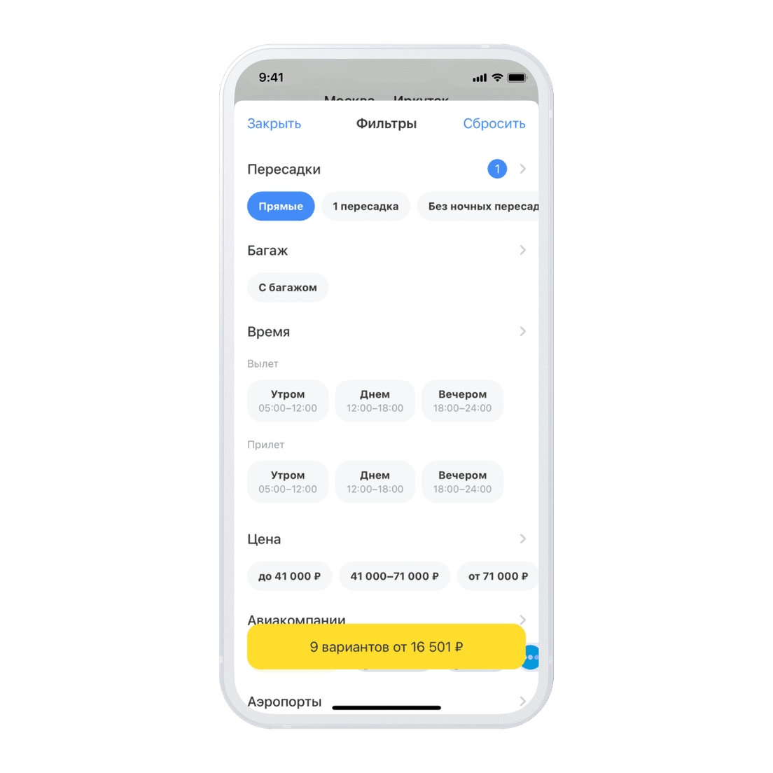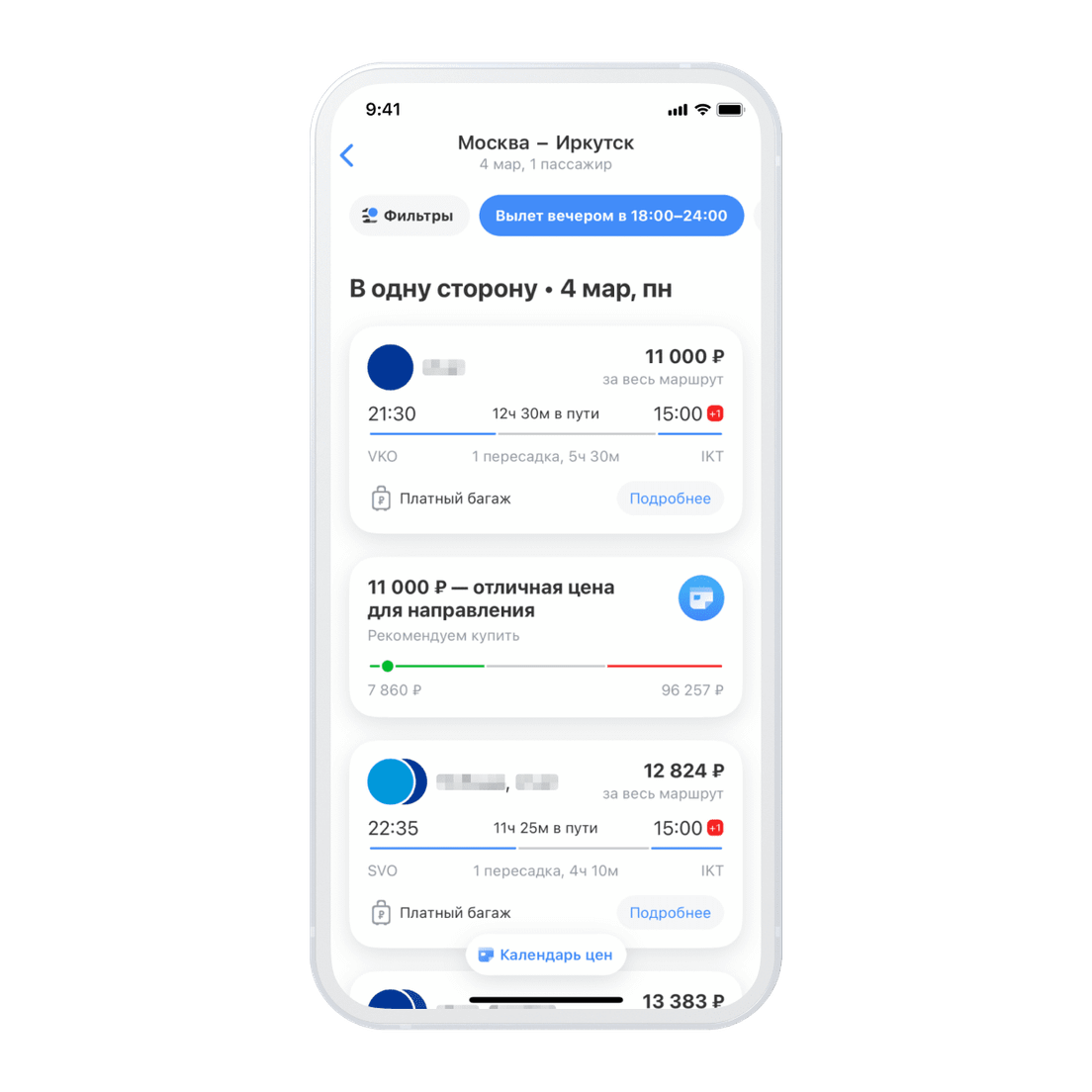 В Авиабилетах можно настроить фильтры, чтобы ускорить поиск подходящих билетов. Например, покажем все варианты с вылетом в вечернее время.