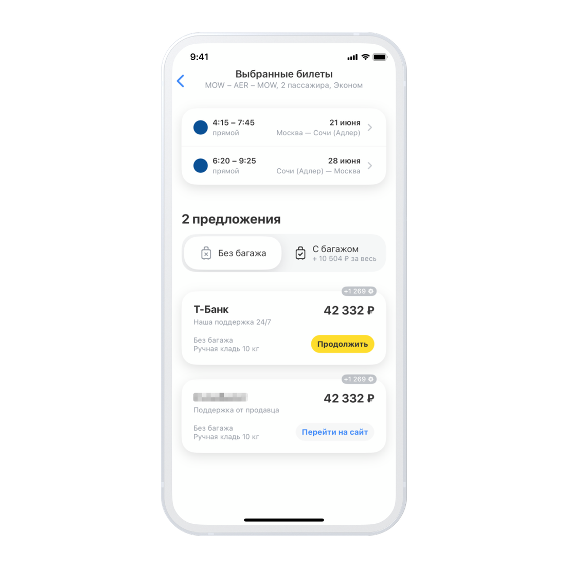 Пример. Выбрали билеты на двоих Москва — Сочи — Москва за 42 332 ₽ в Т‑Путешествиях. Если оплатите их картой Black с подпиской Pro, получите кэшбэк до 1 269 ₽. Если кредиткой All Airlines — 2 963 мили.