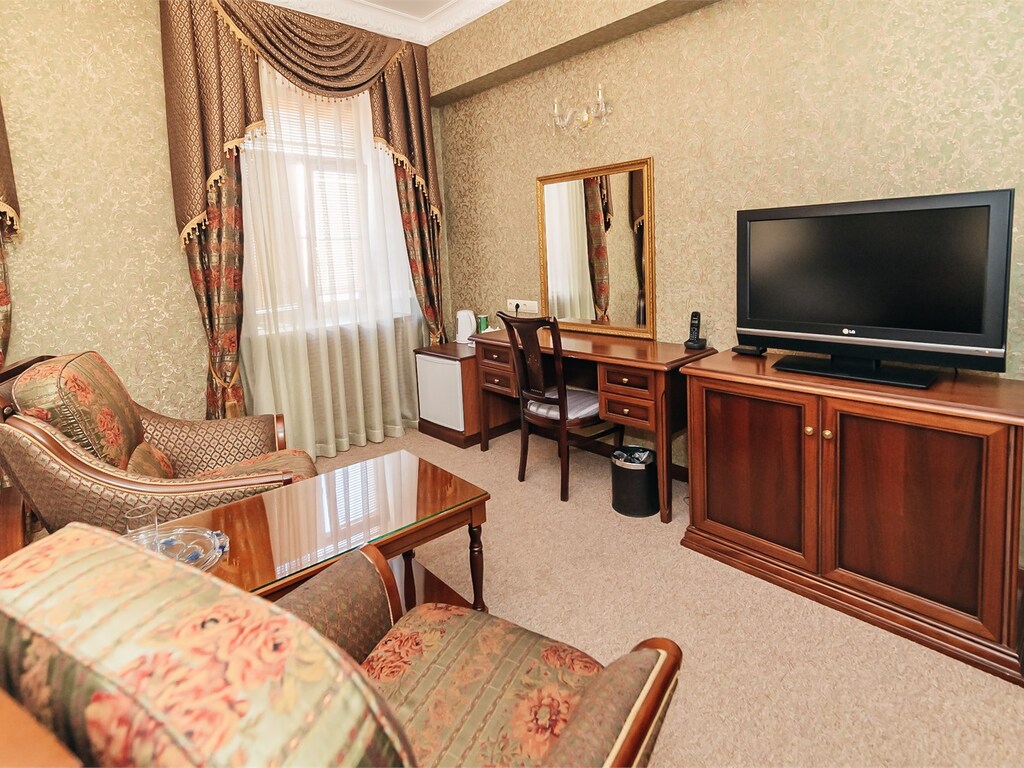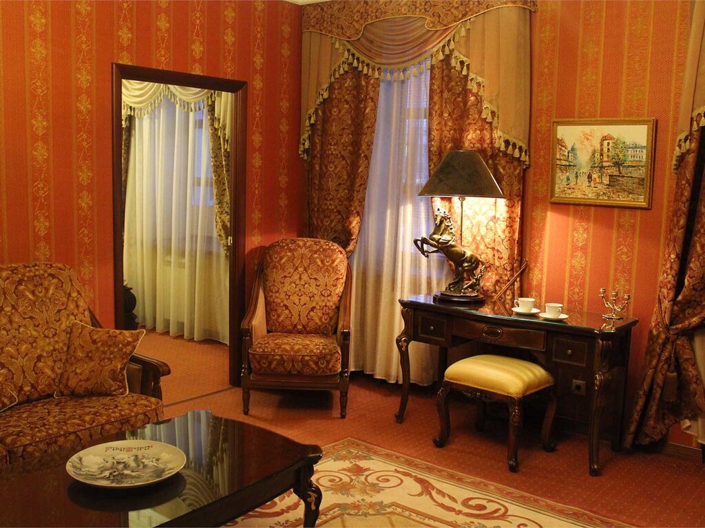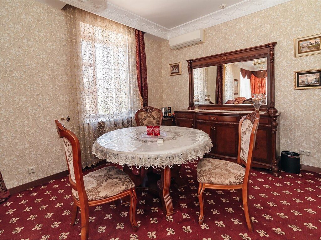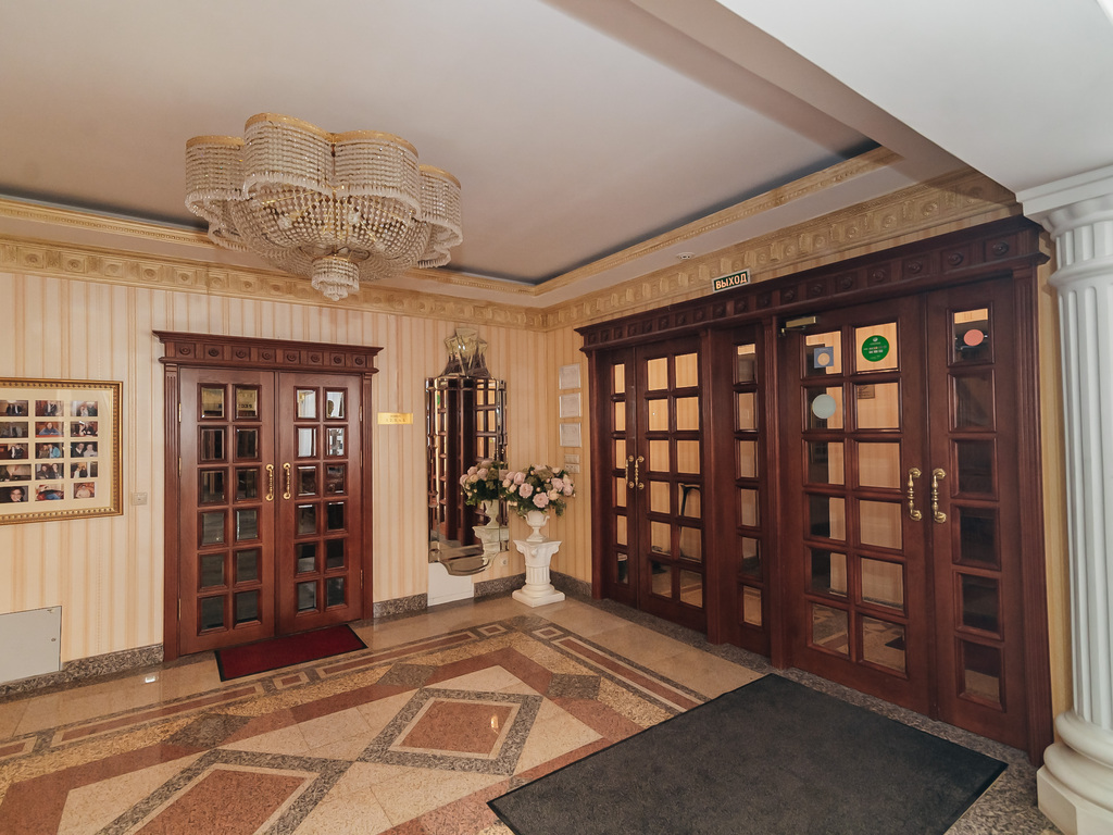 На 1-м этаже расположен ресторан с великолепным залом, оформленным в классическом стиле. Лучшие блюда русской и европейской кухни дарят гостям истинное удовольствие. С 12:00 до 16:00 по будням проходят деловые обеды (бизнес-ланчи), что позволяет пообедать быстро и одновременно вкусно и качественно.