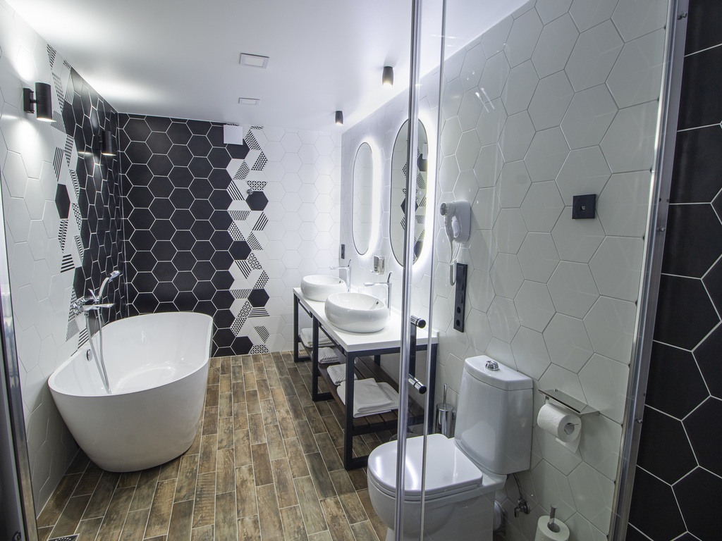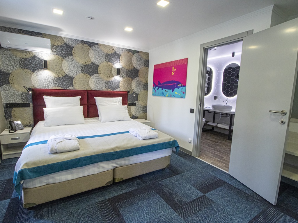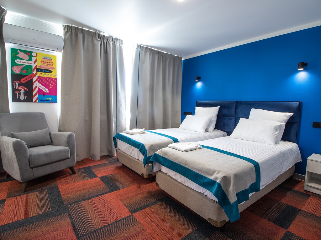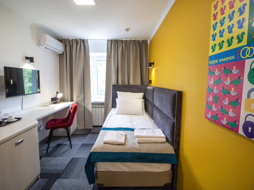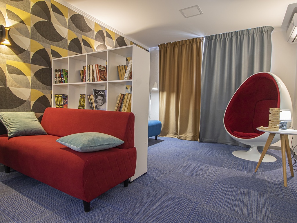 Интерьер номеров 5 этажа продуман до мелочей и выполнен в стиле 60-х годом ХХ века. В каждом номере ванная комната или душевая кабина, теплый пол, кондиционер, новые ортопедические матрасы и яркий стильный дизайн с авторскими постерами.