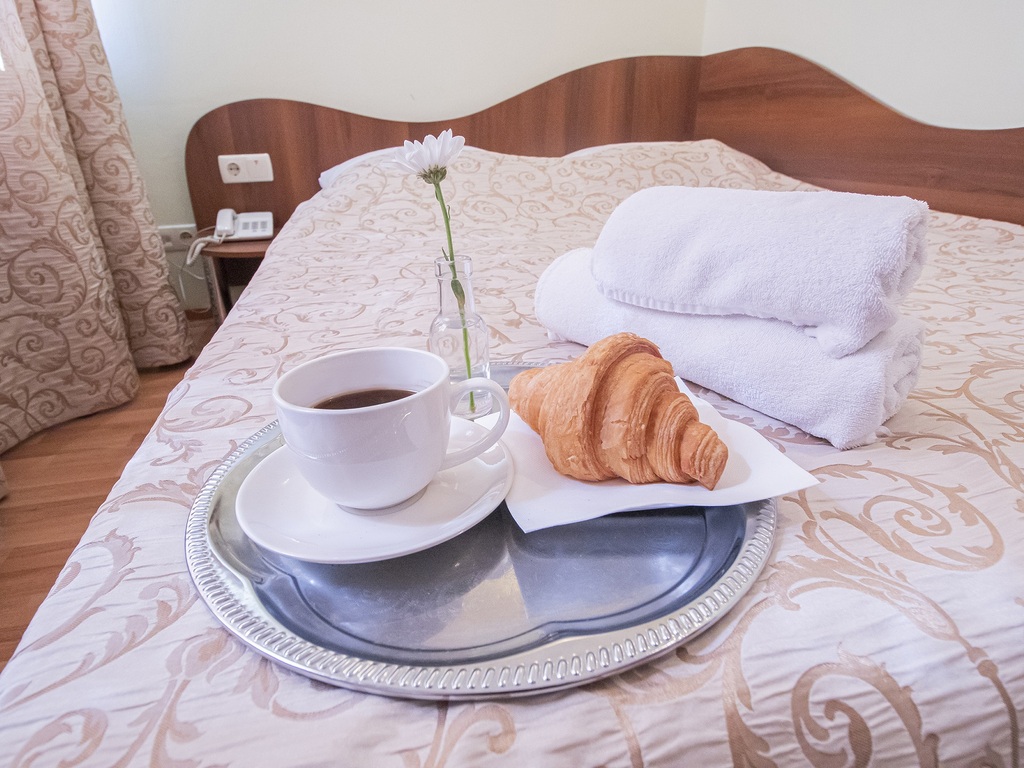 В просторном холле гостиницы открыта мини-кофейня с классическим кофейным меню и свежими круассанами.