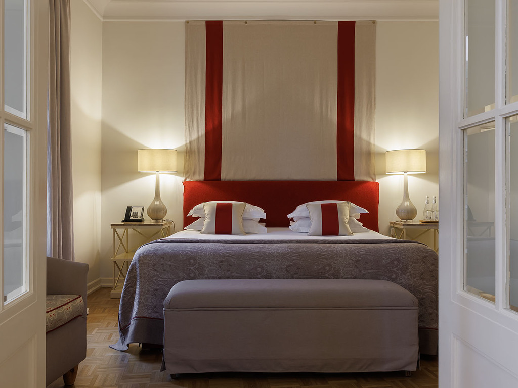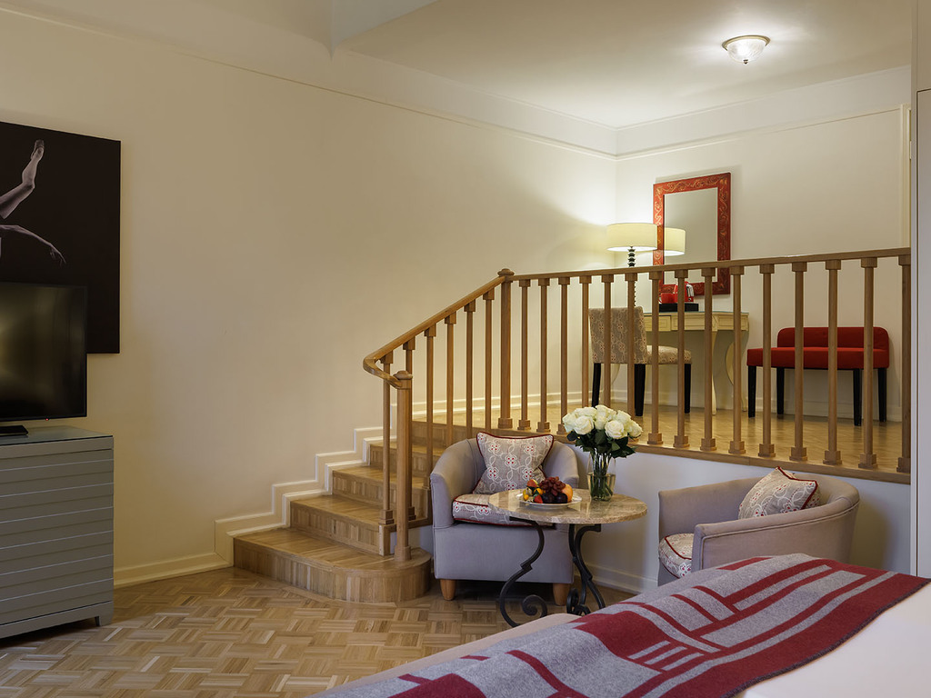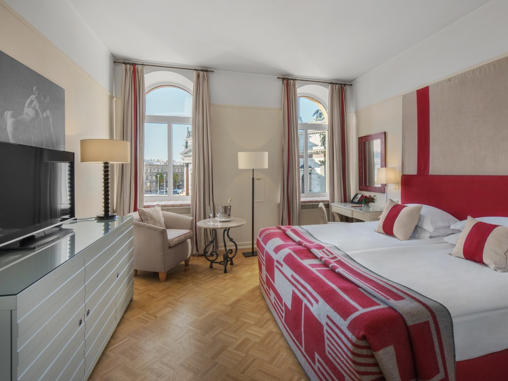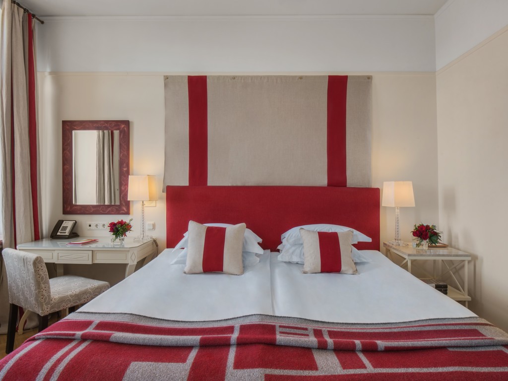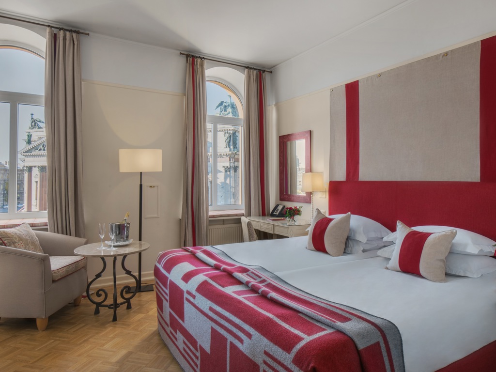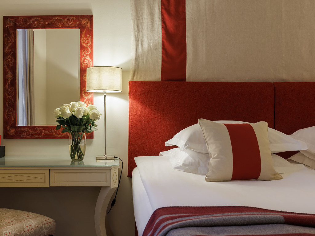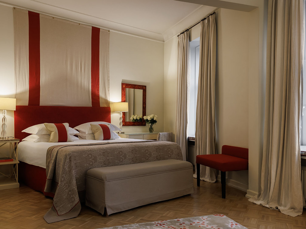 В отеле 192 номера, среди которых есть 5 люксов. Все номера оформлены в классическом и современном стилях, оборудованы элегантной мебелью и аксессуарами. В номерах использованы спокойные цвета, установлены широкие кровати, паркет, мягкое льняное постельное белье. Ванные комнаты отделаны итальянским мрамором. Это создает условия для комфортного отдыха после работы или экскурсии.