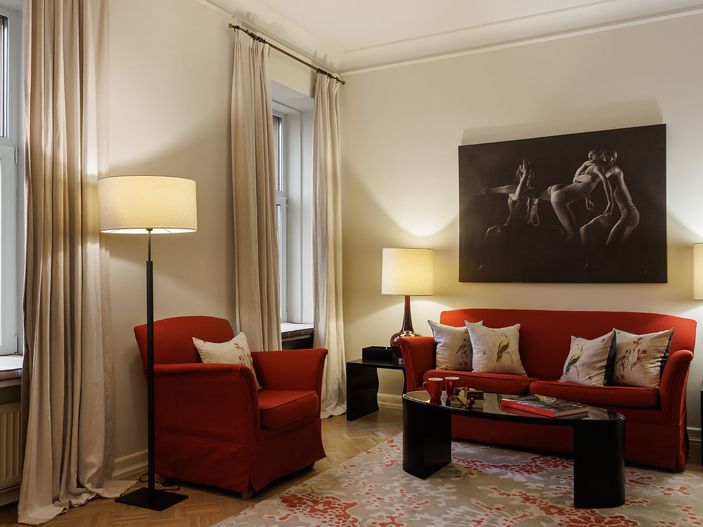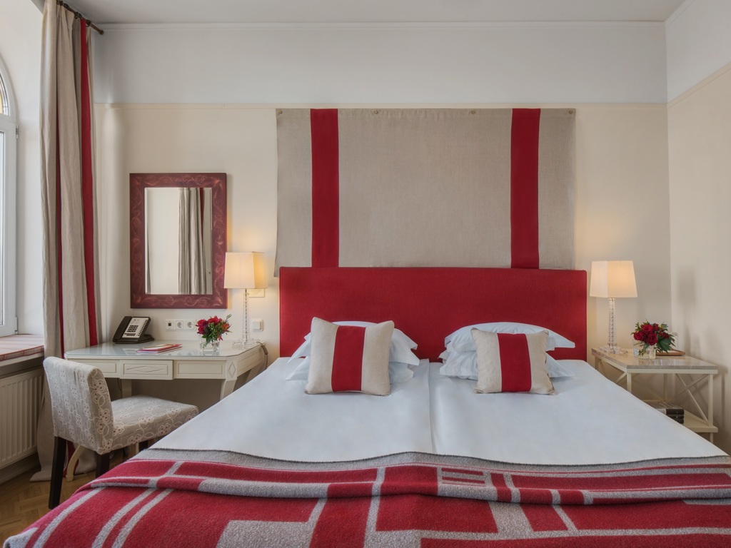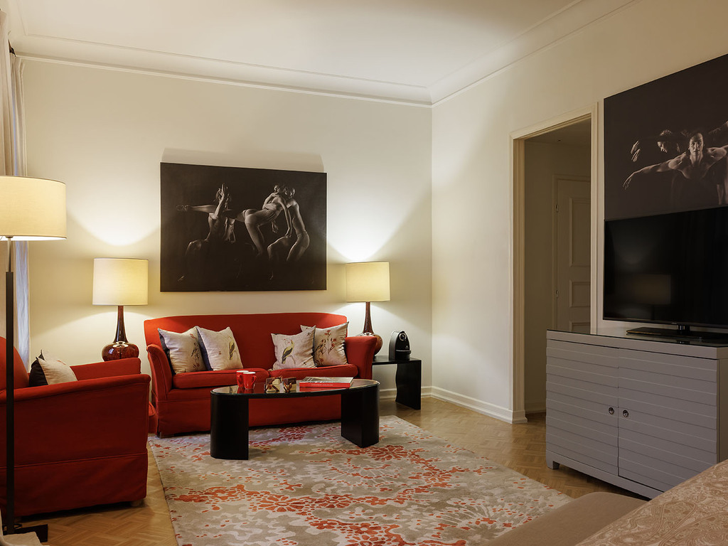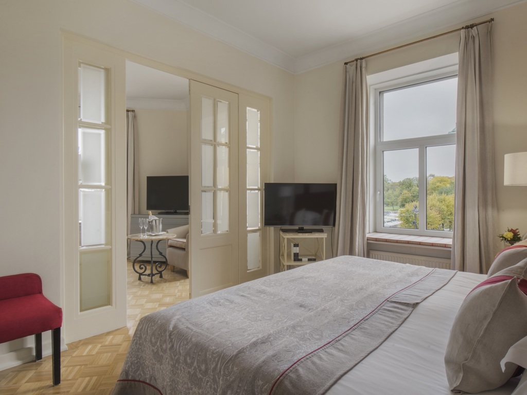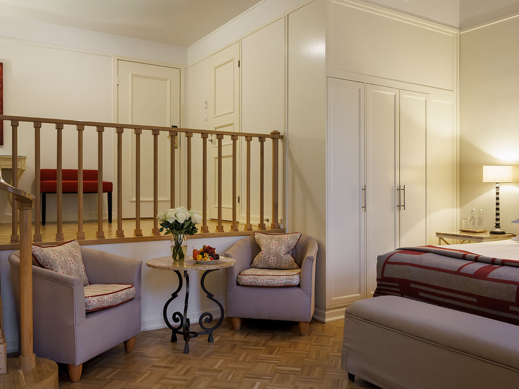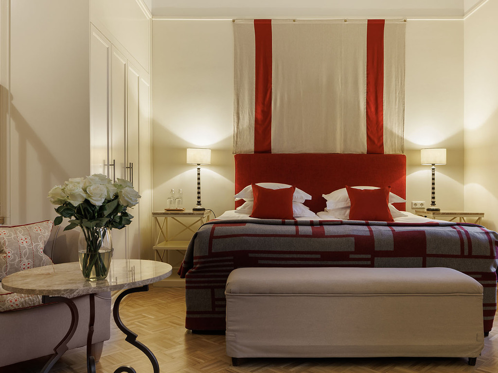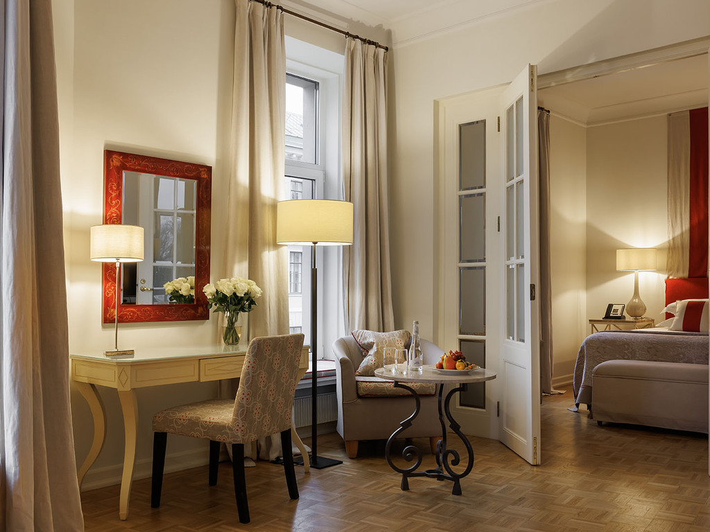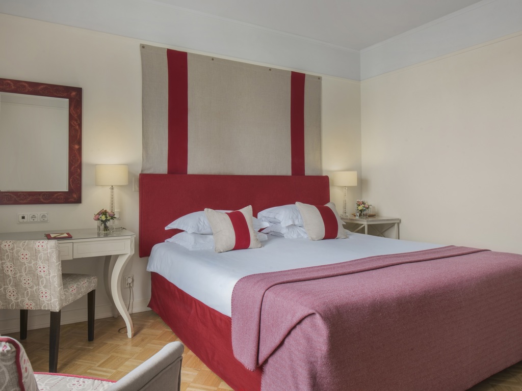 В отеле 192 номера, среди которых есть 5 люксов. Все номера оформлены в классическом и современном стилях, оборудованы элегантной мебелью и аксессуарами. В номерах использованы спокойные цвета, установлены широкие кровати, паркет, мягкое льняное постельное белье. Ванные комнаты отделаны итальянским мрамором. Это создает условия для комфортного отдыха после работы или экскурсии.
