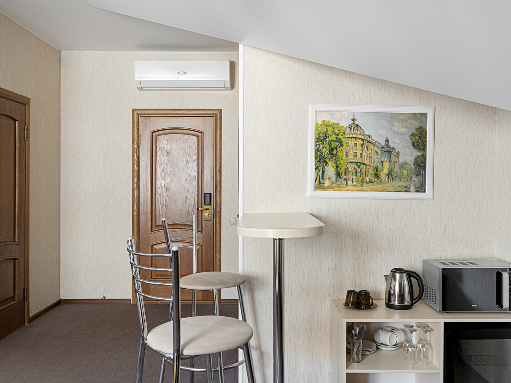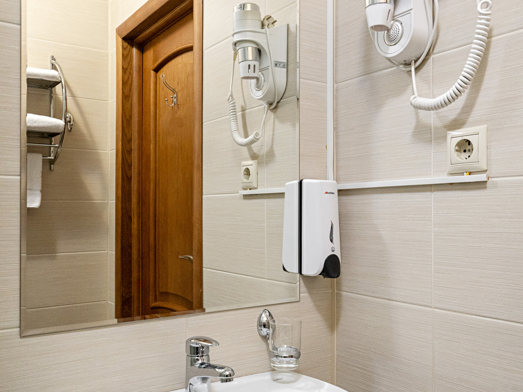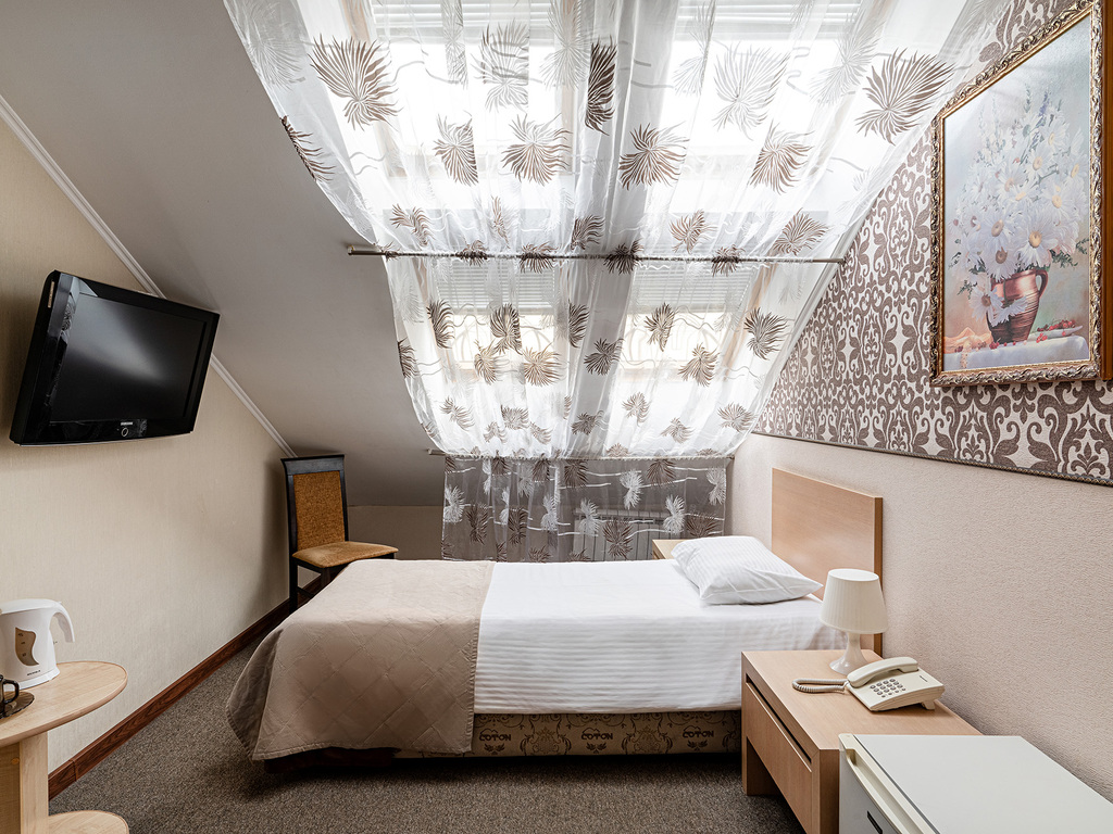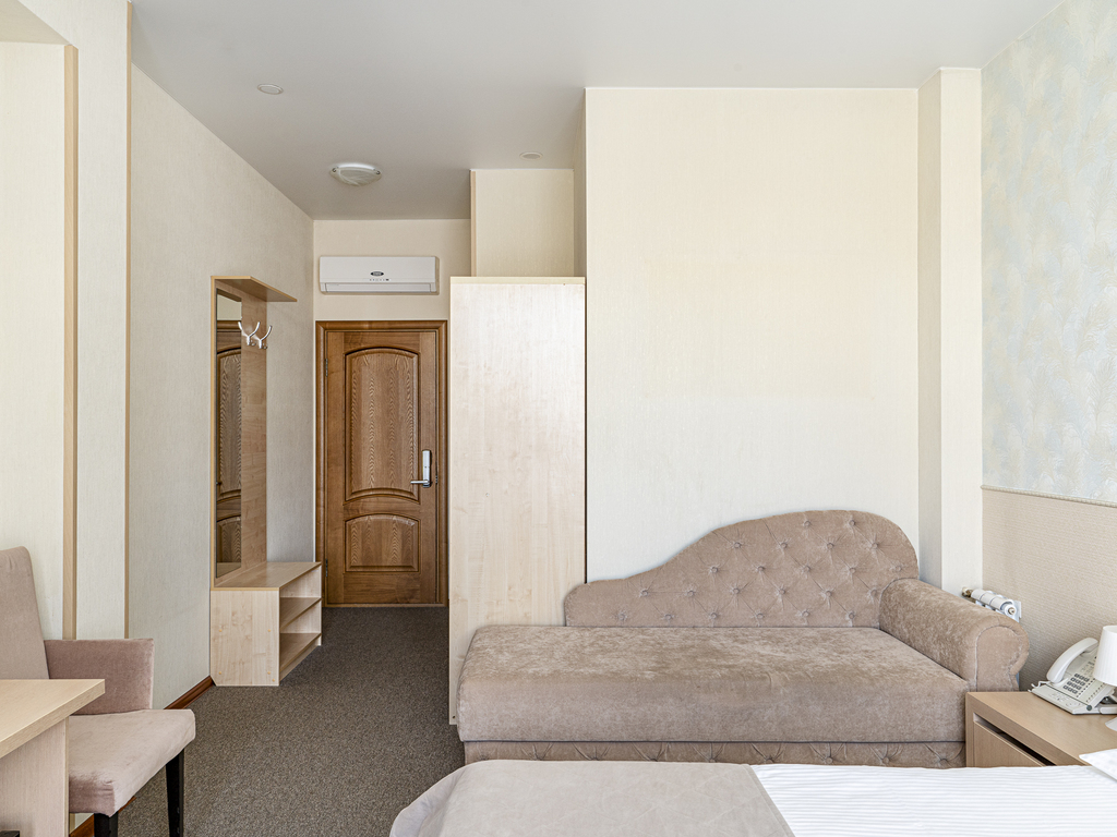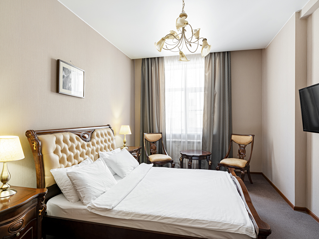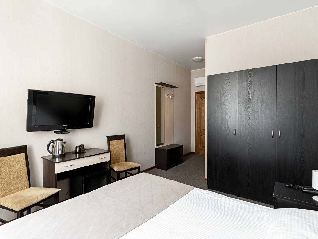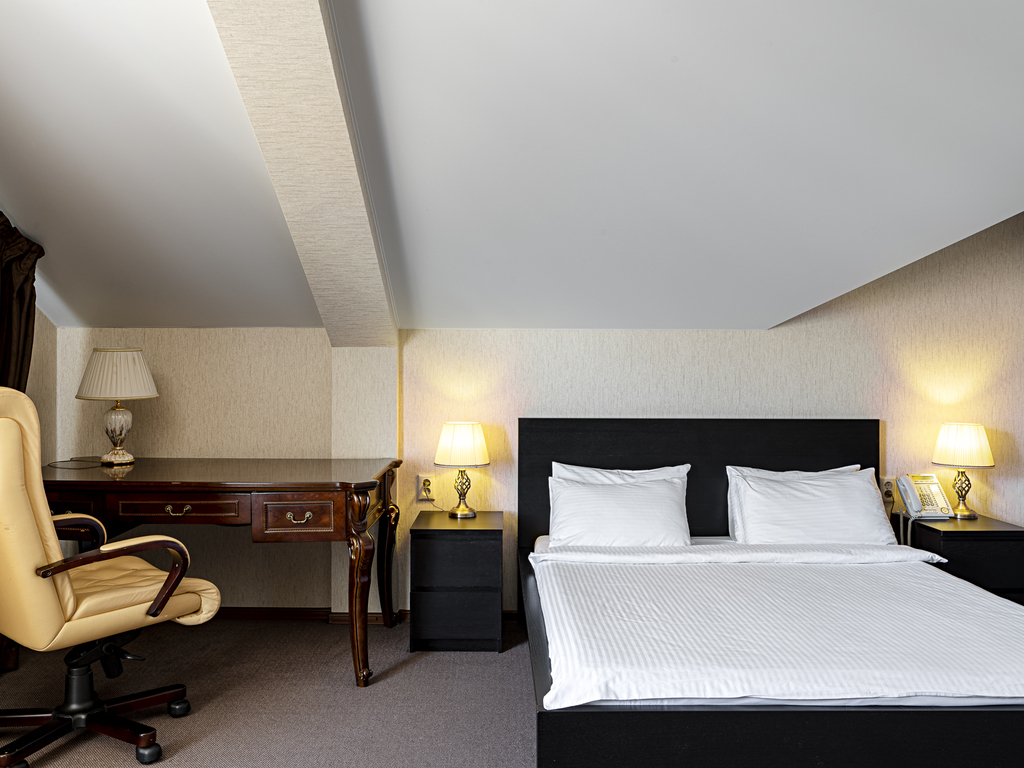 В гостинице есть номера первой (стандарт) и высшей категории. В собственных ванных комнатах имеется душ, туалет, фен, набор полотенец и гигиенические принадлежности. Комнаты оборудованы современной техникой и мебелью.