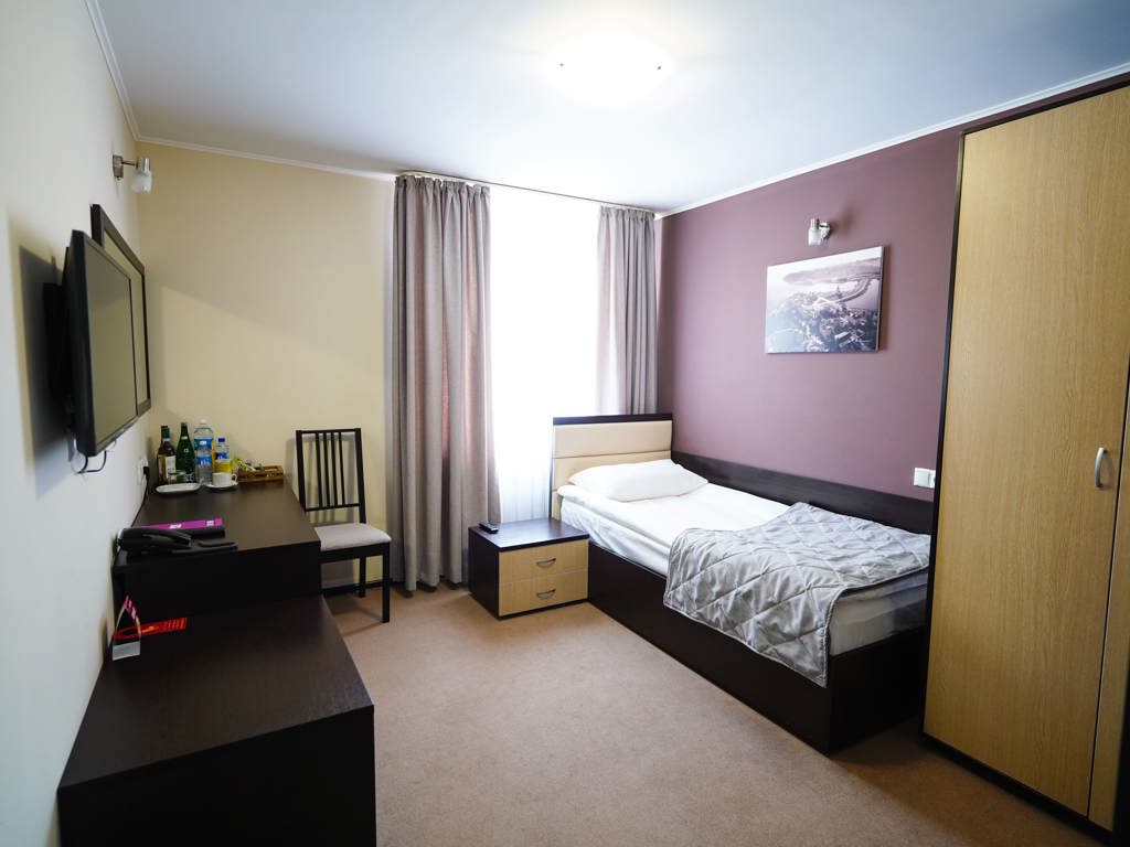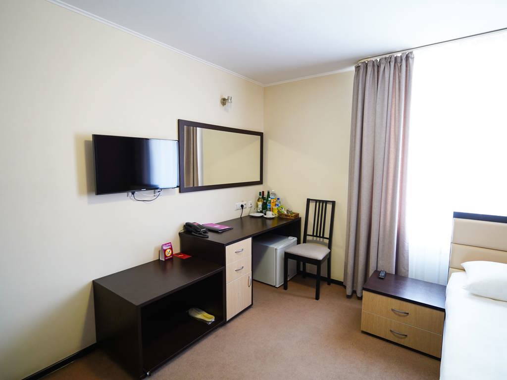 В отеле 46 номеров: одноместные и двухместные номера эконом, стандарт, студия, студия двухместная, стандарт-комфорт, люкс, апартаменты и президентский номер.