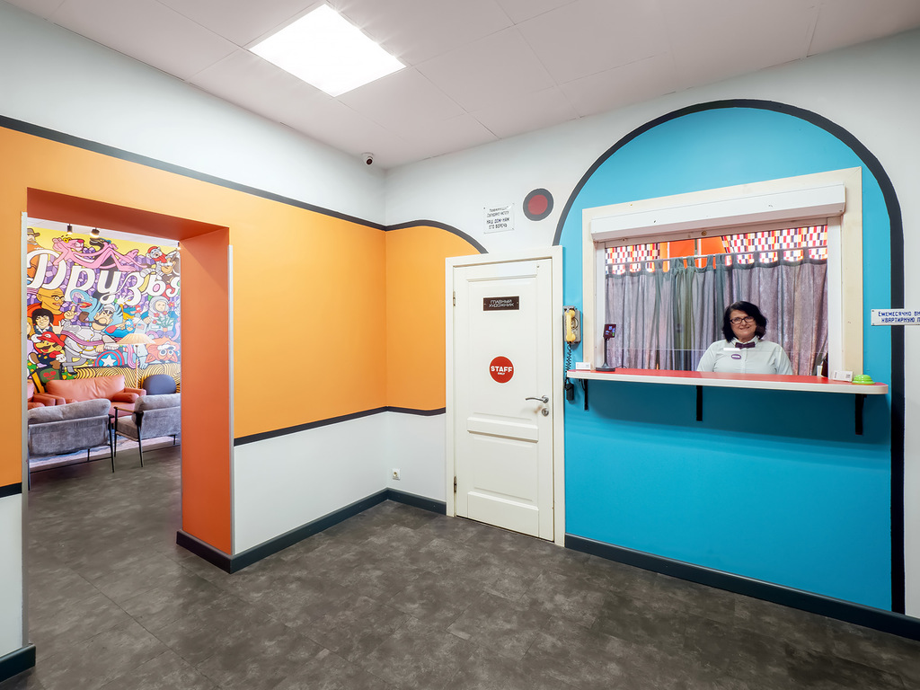 Вход в хостел расположен на улице Восстания. На втором этаже за стойкой круглосуточно дежурят администраторы. Гостей «Друзей» радушно встретят, помогут разместиться и дадут необходимую информацию о городе. Рядом ресепшен располагается просторная и уютная гостиная, наполненная любопытными ретро-вещицами и сувенирами советских времен, с мягким кожаными диванами, большим телевизором и настольным футболом.
