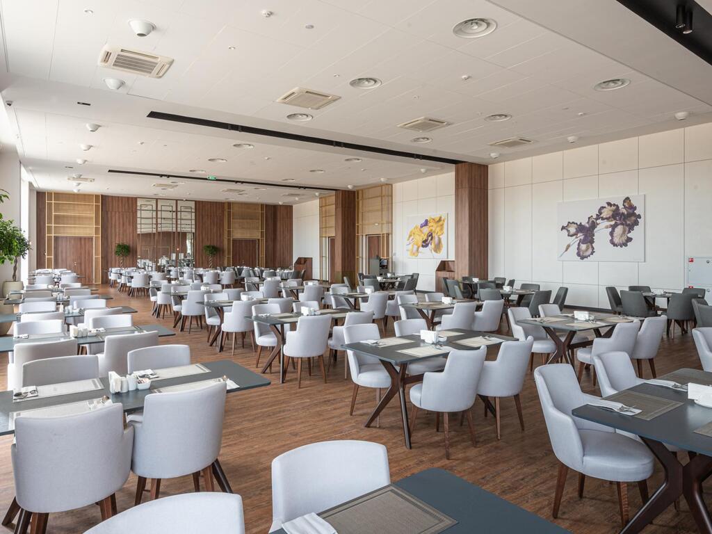 Просторный светлый зал ресторана в теплое время года дополняет открытая веранда с прекрасным обзором на всю территорию отеля.