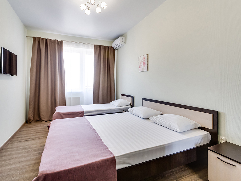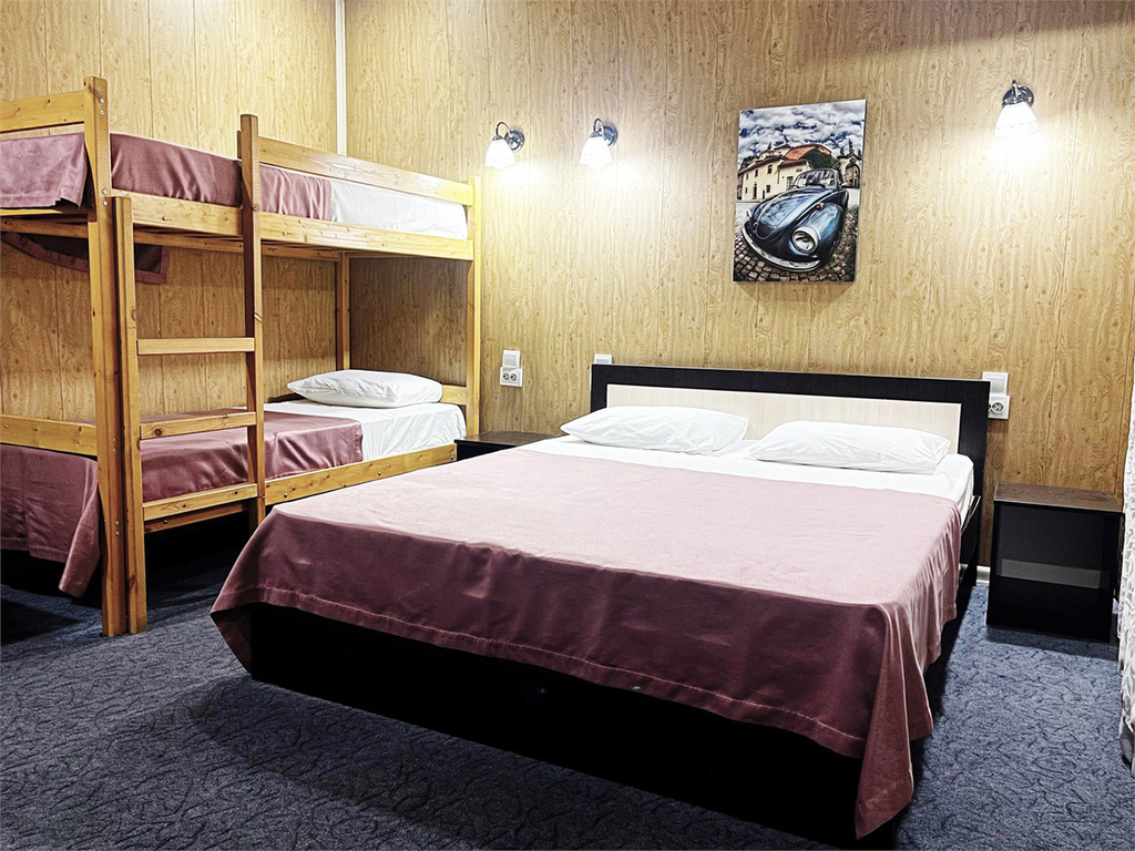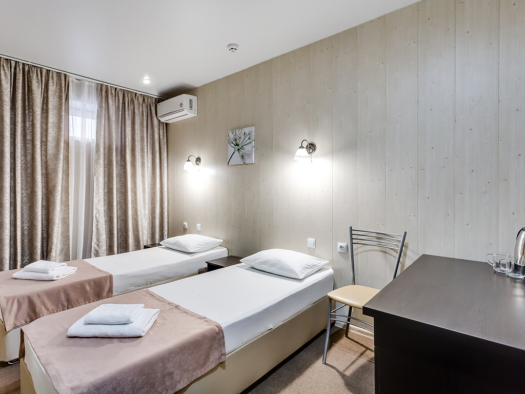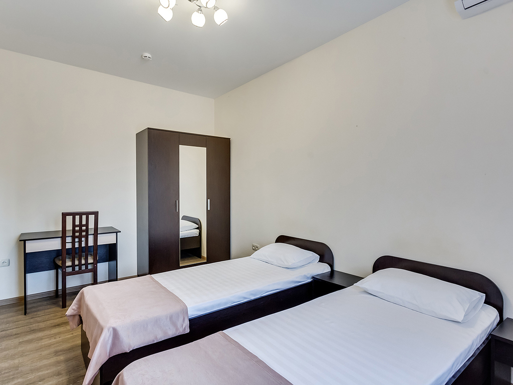 Есть комнаты, как с большой двуспальной кроватью, так и с двумя односпальными кроватями. Также в есть семейные комнаты для трехместного размещения с одной двуспальной кроватью и одной односпальной кроватью.