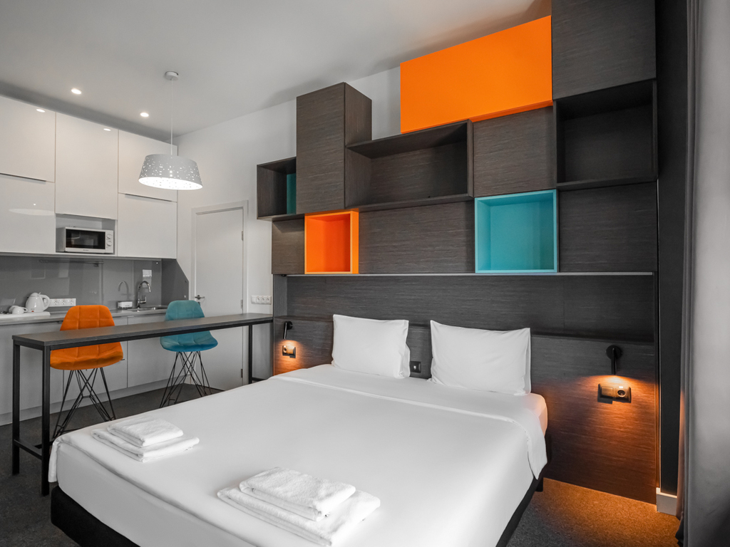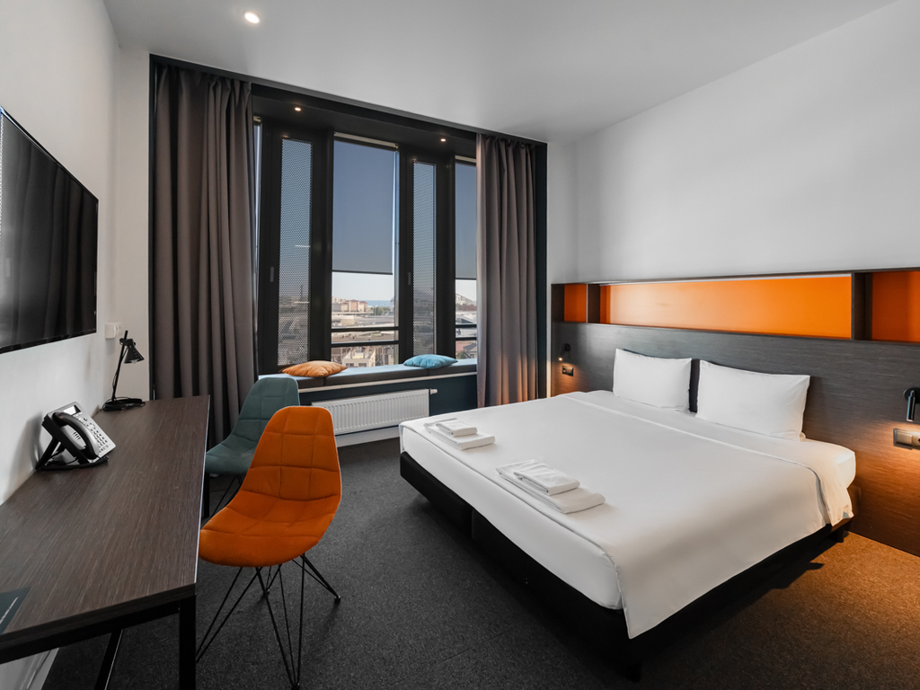 В отеле есть семь категорий номеров с дизайнерским оформлением, которые рассчитаны на проживание до 8 гостей. Из панорамных окон открывается вид на Кавказские горы и олимпийские объекты.