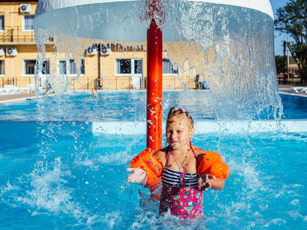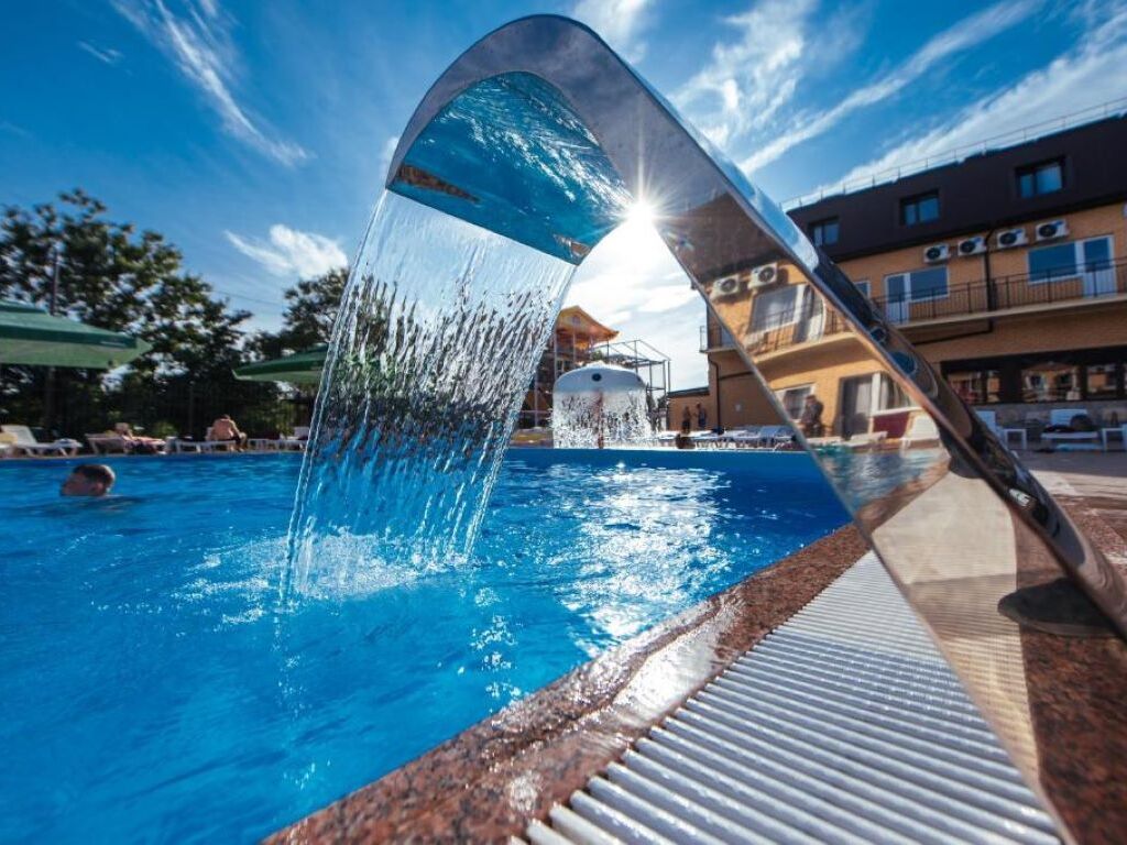 На территории гостиничного комплекса располагается огромная терраса с большими открытыми плавательными бассейнами с подогревом для взрослых и детей, которые могут плавать, принимать водный массаж, уютно размещаться на шезлонгах, а также за столиками, под зонтами.